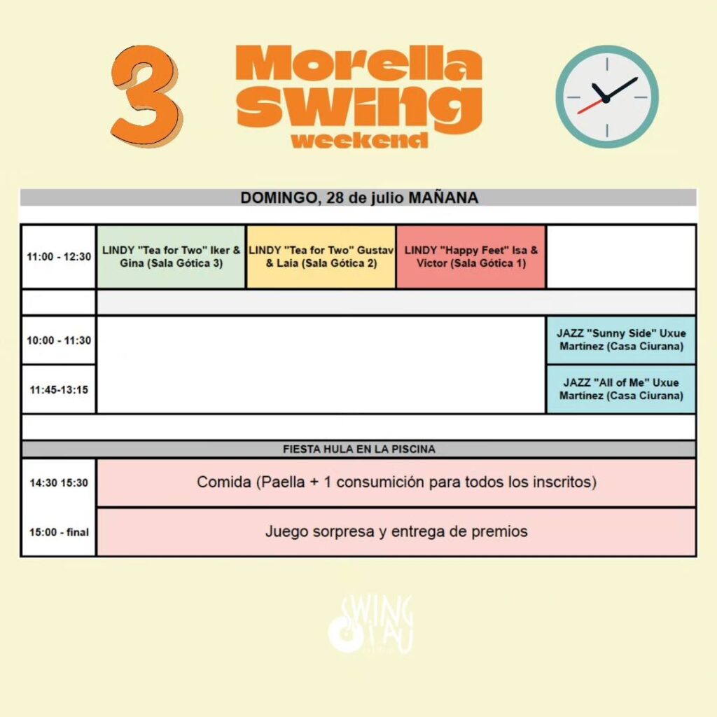 - CLASE LINDY «9:20 SPECIAL»: Clase de 2h con Gustav y Laia dirigida a bailarines y bailarinas experimentadosde Lindy Hop y Solo Jazz (mínimo 3 años), que busquen un reto. Imprescindible apuntarse en pareja.